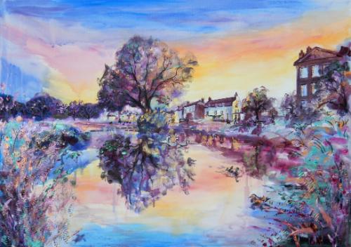 Commissioned painting of Barnes Pond (SW13, London) by sunset, highlighting the Sun Inn and refle... Read more