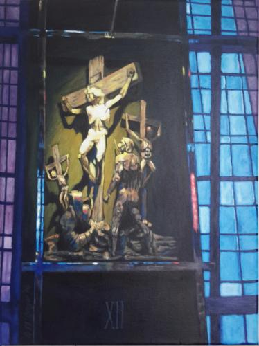 This is a painting of the twelth station of the cross in Liverpool's RC Cathedral.
