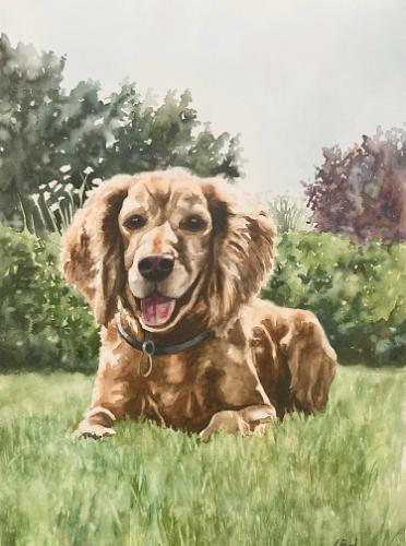 This is a watercolour of a beautiful, loved family dog in a favourite location.
