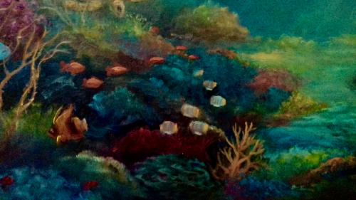 Tropical underwater scene with seahorses, turtles, tropical fish, shafts of light.